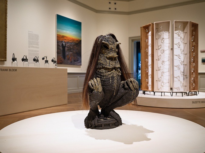 “Ik heb een zwangere zeegodin met paardenhaar gemaakt,” onthult kunstenaar Folkert de Jong. Hij vertolkt de stem van de zee en duinen met mythische natuurgoden. Ze zijn gemaakt van klei en afgewerkt met glazuur uit Rotterdamse bagger, ofwel vervuild havenslib van Urban Glaze. “Toen ik mijn zeegodin creëerde, vroeg ik mij wel af wie haar dan zwanger heeft gemaakt?” Als onderdeel van de tentoonstelling, op enkele minuten loopafstand van Panorama Mesdag, is bij kunstinstelling Stroom Den Haag werk van Anne Jesuina te zien. ‘In de ogen van het water’ is eveneens een mythologische confrontatie: een wezen zonder naam, geboren uit de kruisbestuiving van Zeeuwse, West-Afrikaanse en Braziliaanse watergeesten, stijgt op uit de Noordzee. Het beweegt door een landschap dat ooit één was, waar kust en duin geen grenzen waren maar verbindende plekken van mensen, verhalen en herinnering.